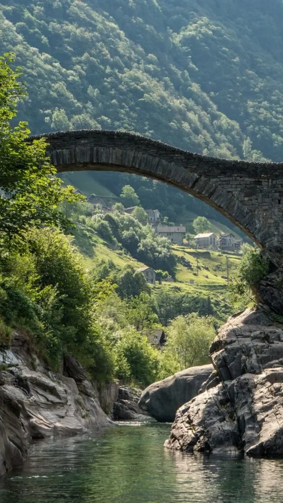 Zakończ podróż w dolinie Verzasca. Przejdź przez kamienny most Ponte dei Salti, zanurz się w szmaragdowej rzece i odpocznij w cieniu drzew.