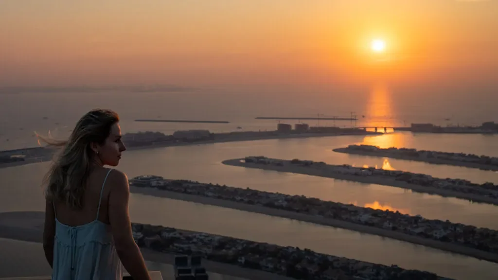 Całą budowlę najlepiej podziwiać z punktu widokowego „The view at the palm”. Planowaliśmy właśnie tutaj oglądać zachód słońca, niestety wszystkie bilety na tą określoną porę były już zarezerwowane. W związku z tym zdecydowaliśmy się na wejście o godzinie 16. Na miejscu okazało się jednak, że nie ma ograniczenia czasowego na bilecie. Nikt z obsługi nie poprosił nas o wyjście. W związku z tym, zostaliśmy do godziny 18 żeby pooglądać piękne, pastelowe niebo i zachodzące słońce na tle sztucznej palmy. A za plecami mieliśmy wysokie wieżowce i Dubaj Marinę.