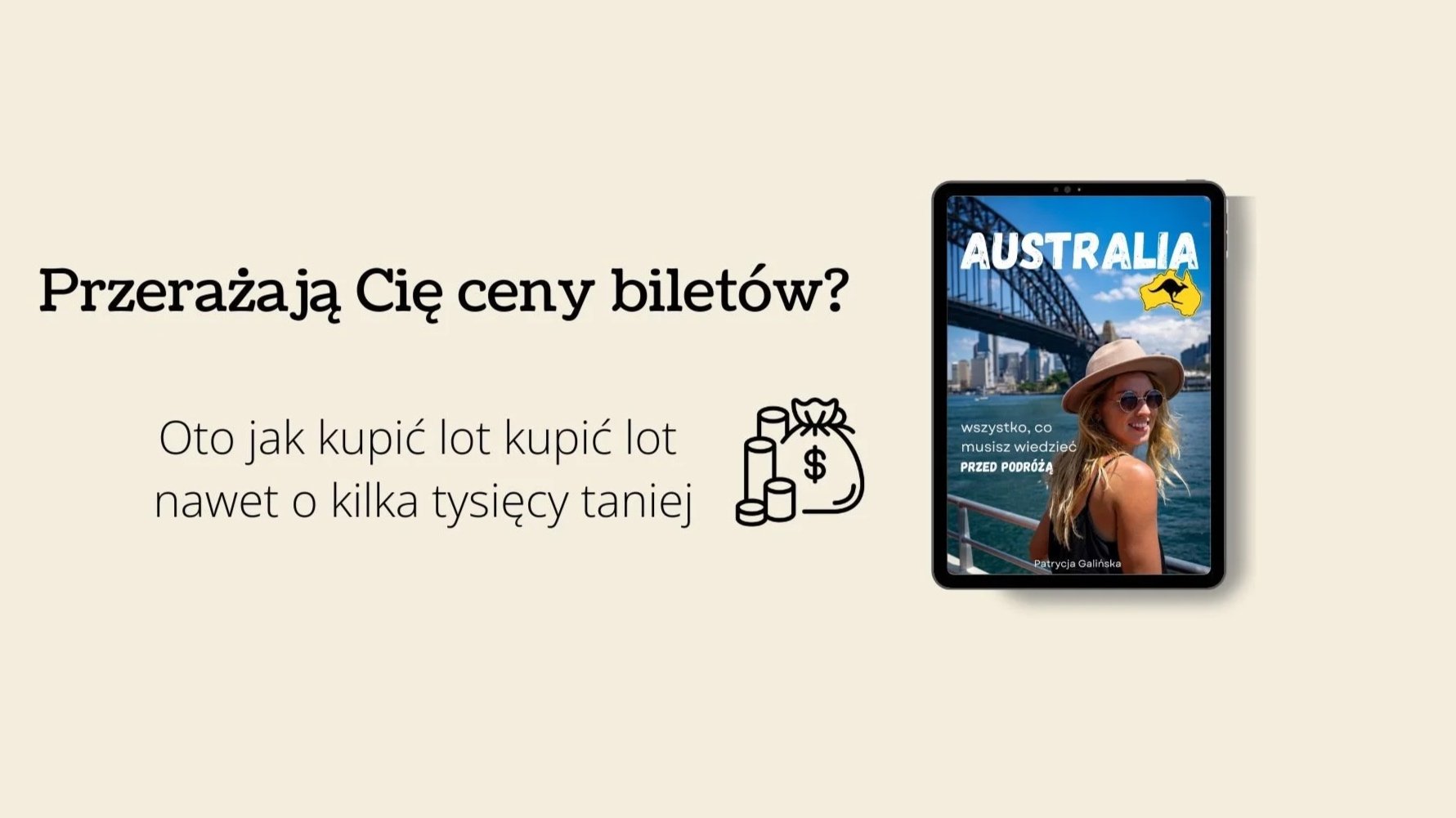 W ebooku o podróży do Australii wyjaśniam swoje sprawdzone sposoby – od wyboru odpowiednich lotnisk wylotu, przez alerty cenowe, po moment zakupu biletów, który realnie robią różnicę przy tak długiej trasie.