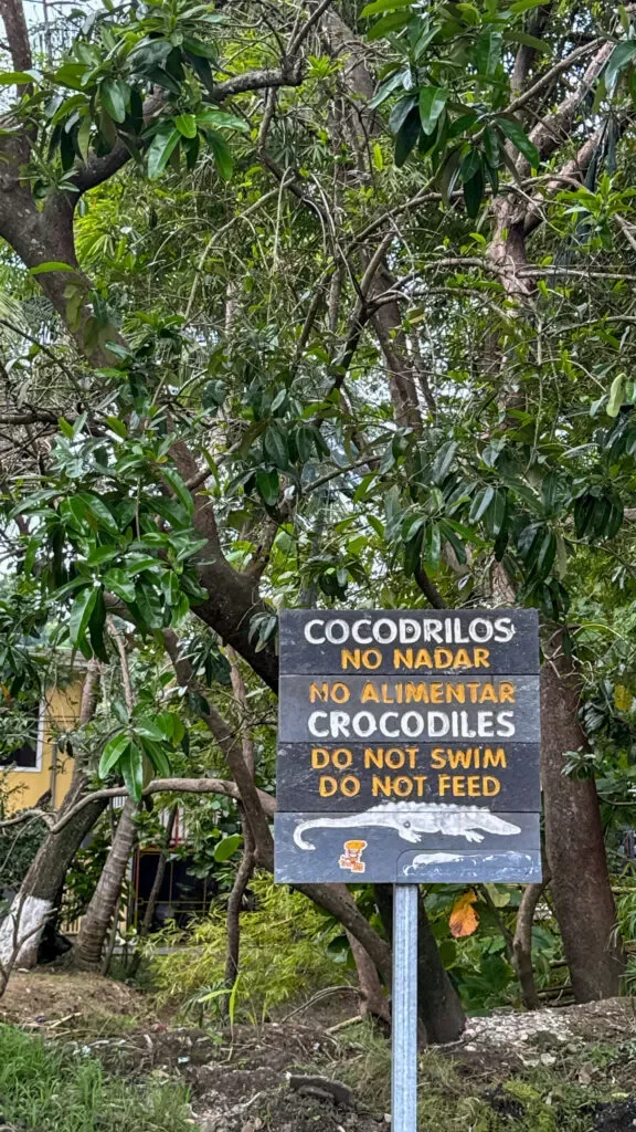 Jeśli będziesz spacerować po Quepos, zwróć uwagę na rzekę tuż obok dworca autobusowego. Robiąc zakupy spożywcze lub odwiedzając knajpy w Quepos trzeba przejść na drugą stronę strumyczka, a w okolicy mostu widziałam wielokrotnie…. krokodyle. Co prawda, jest tam znak o zakazie kąpania się. Daję znać wcześniej abyś nie zeszła na zawał tak jak spacerując sobie swobodnie po mieście i widząc jednego z nich.