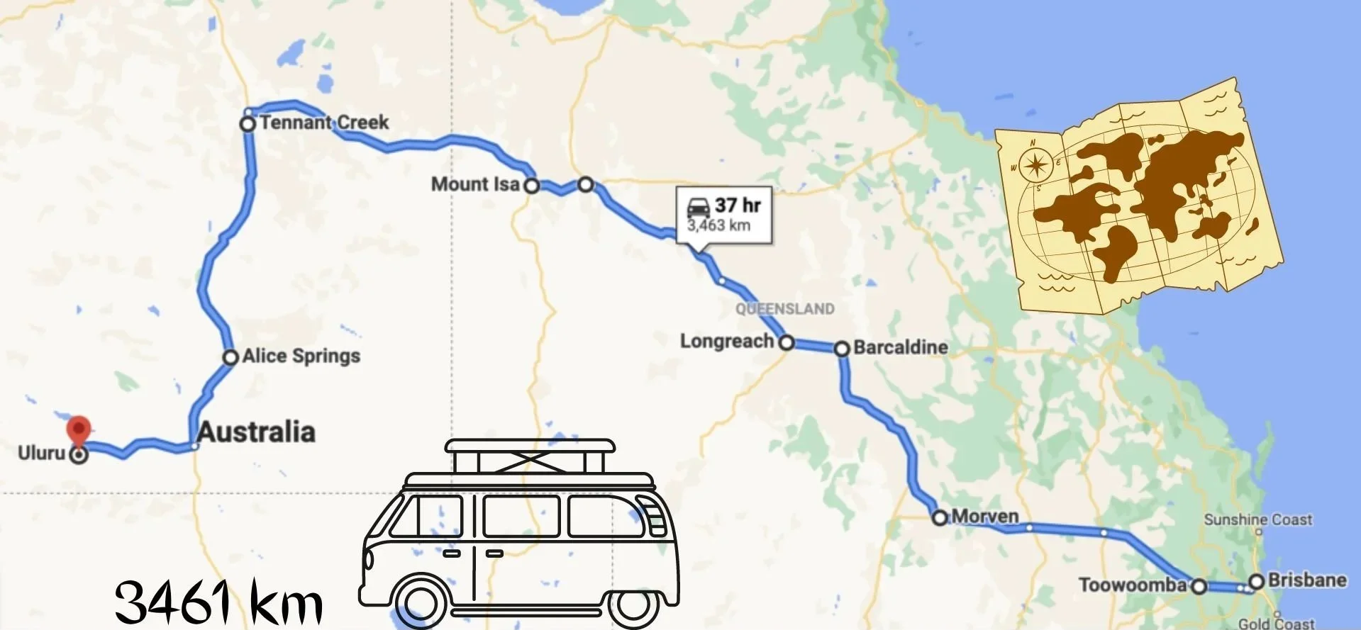 Cala podróż do Uluru zajęła nam 4 dni ciągłej jazdy, z małymi przystankami na jedzenie. Przejechaliśmy w sumie prawie 3500 km w jedną stronę. Zdecydowaliśmy się jechać dłuższą trasą przez Tennant Creek, zamiast bezpośrednio z Longreach do Alice Springs. Krótsza droga jest żwirowa, a ubezpieczenie naszego campera nie pokrywało strat wyrządzonych na drogach bez asfaltu. Dobrze, że nie byliśmy ograniczeni czasowo, więc mogliśmy nadrobić dodatkowe 400km. Planując Waszą podróż koniecznie sprawdźcie stan dróg planowanej trasy.