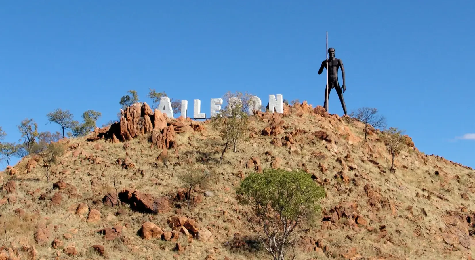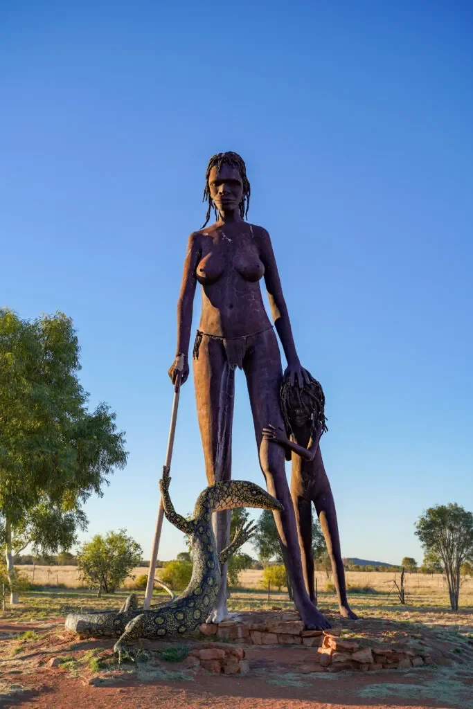 Na północ od Alice Springs trafiliśmy na imponujący, 17-metrowy posąg ważący prawie 8 ton. Jego autorem jest australijski rzeźbiarz Mark Egan, a inspiracją miał być… słynny napis Hollywood. Podobnie jak on, „Anmatjere Man” ma być widoczny z daleka i przyciągać uwagę podróżników przemierzających australijski outback.