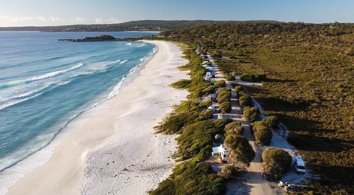 Adres: Camping przy Swimcart Beach w Bay of Fires na Tasmanii.