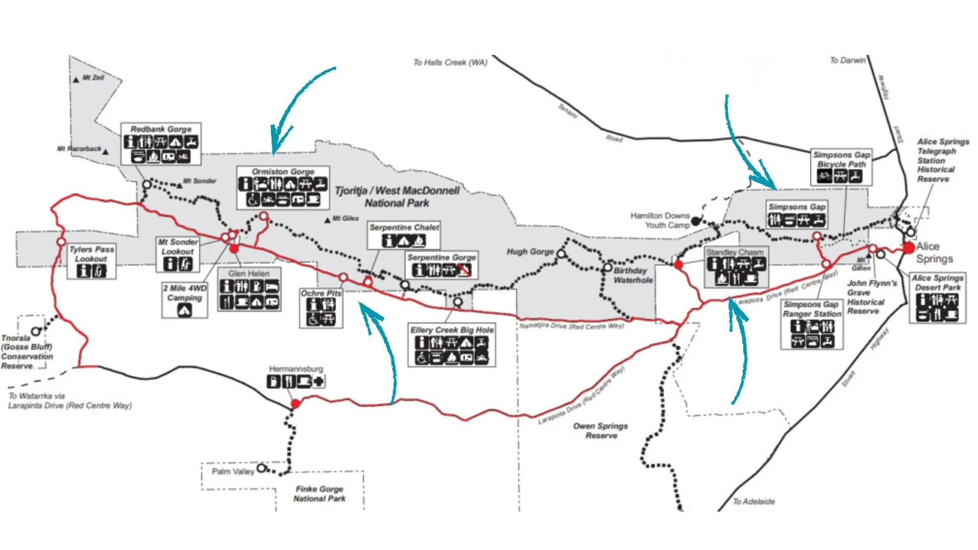 Wszystkie 4 opisane powyżej atrakcje są położone na terenie parku Macdonnel Ranges i dostaniecie się do nich w niecałe 15 min z poszczególnych parkingów – są to łatwo dostępne punkty nie wymagające długich wędrówek.