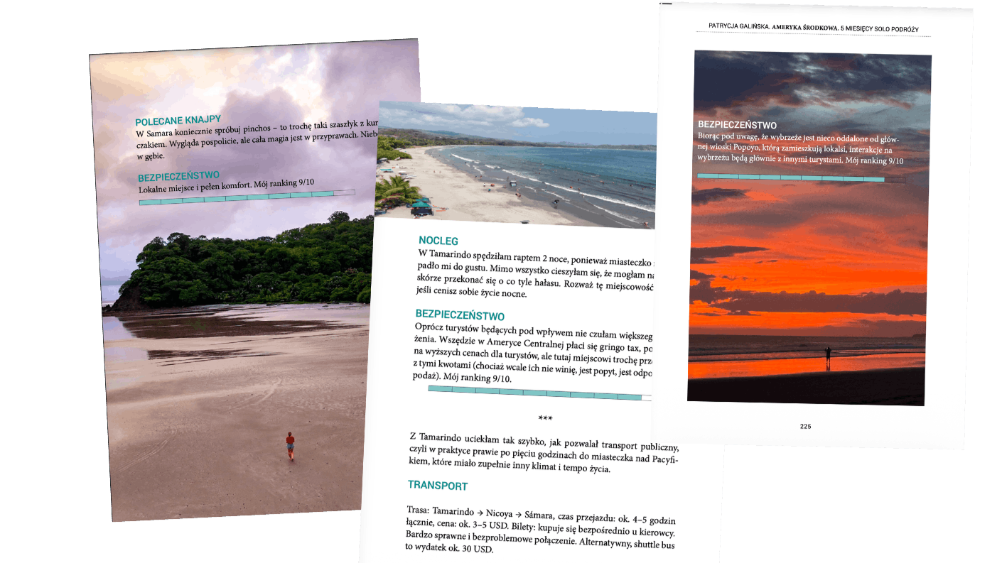 Podczas tej wyprawy – podobnie jak w Gwatemali, Nikaragui czy Panamie – prowadziłam zapiski z drogi. Część z nich, razem z praktycznymi informacjami o trasie od Meksyku aż po Panamę, znalazła się później w moim ebooku o samotnej podróży przez Amerykę Środkową. To zapis doświadczeń i decyzji podejmowanych po drodze (oczywiście polecenia wspaniałych miejscówek tez się znalazły) – dla tych, którzy lubią podróżować świadomie i po swojemu.